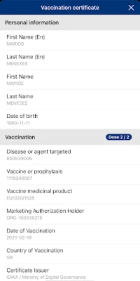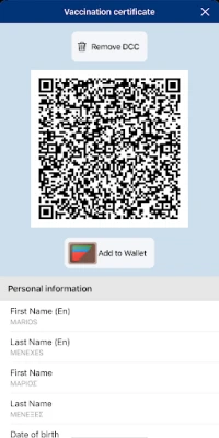 Η επίσημη ελληνική εφαρμογή wallet των Ελληνικών και Ευρωπαϊκών ψηφιακών πιστοποιητικών COVID (Digital Covid Certificates) διατίθεται μέσω του επίσημου λογαριασμού της Ελληνικής Δημοκρατίας και δίνει τη δυνατότητα καταχώρησης των πιστοποιητικών και βεβαιώσεων στην εφαρμογή για την καθημερινή χρήση όπου αυτά απαιτούνται.