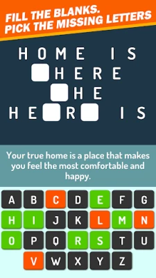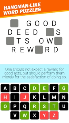 The game-play is similar to the classic Hangman game, but with proverbs, idioms, wise-sayings and famous quotes. You're presented with a fill-in-the-blank letters, along with alphabet letters which you can choose to fill in the grid, to complete the mystery phrase.