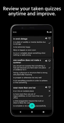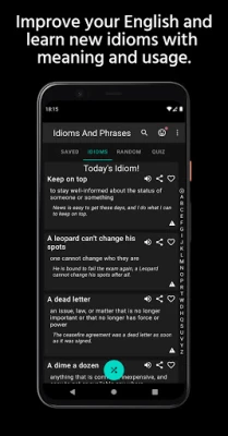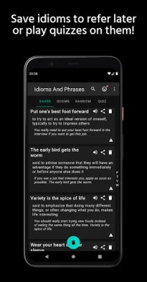 The app contains a collection of relevant, useful and popular English idioms, phrases, proverbs and phrasal verbs and other common expressions. Includes definitions, meanings, examples, usage and pronunciation in a dictionary like yet fun format.